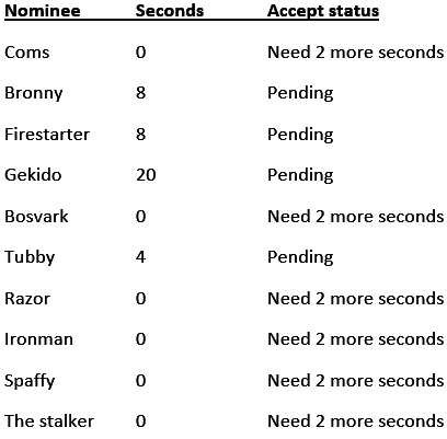 I nominate @TheStalker for secretary and second @Gekido and @Bronny