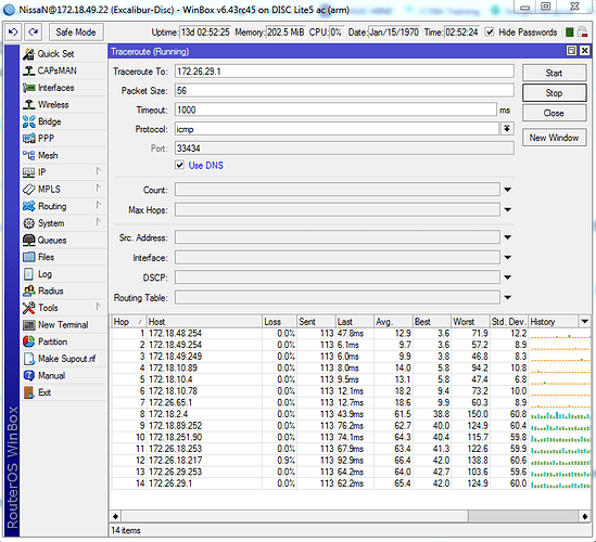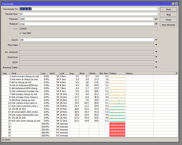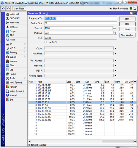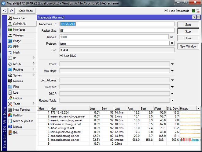 I stopped the trace and re-started it with DNS box disabled to see what the ip of that hop was so that I could later use this info to log into that rb with ctwug account and continue troubleshooting from there. . .