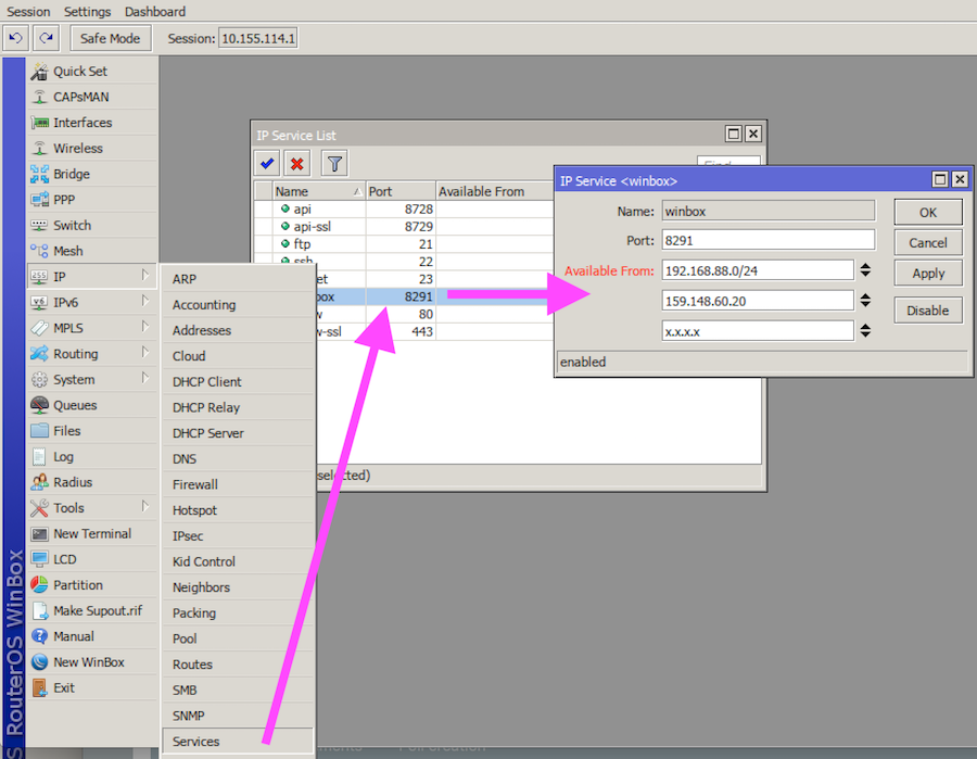 What do do: 1) Firewall the Winbox port from the public interface, and from untrusted networks. It is best, if you only allow known IP addresses to connect to your router to any services, not just Winbox. We suggest this to become common practice. As an alternative, possibly easier, use the “IP → Services” menu to specify “Allowed From” addresses. Include your LAN, and the public IP that you will be accessing the device from. 2) Change your passwords.