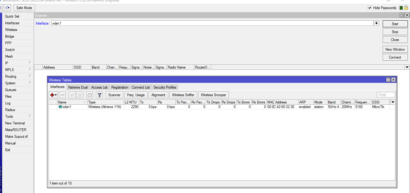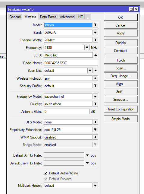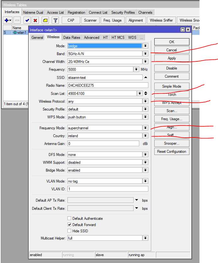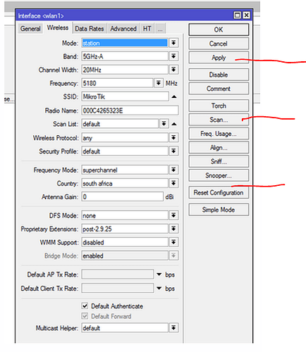 double click on that wlan1 then it will open n new window then click the wireless tab all the settings is on that page and then on the right is n menu click on advanced mode looks like u are using a rb493G and ROS looks old